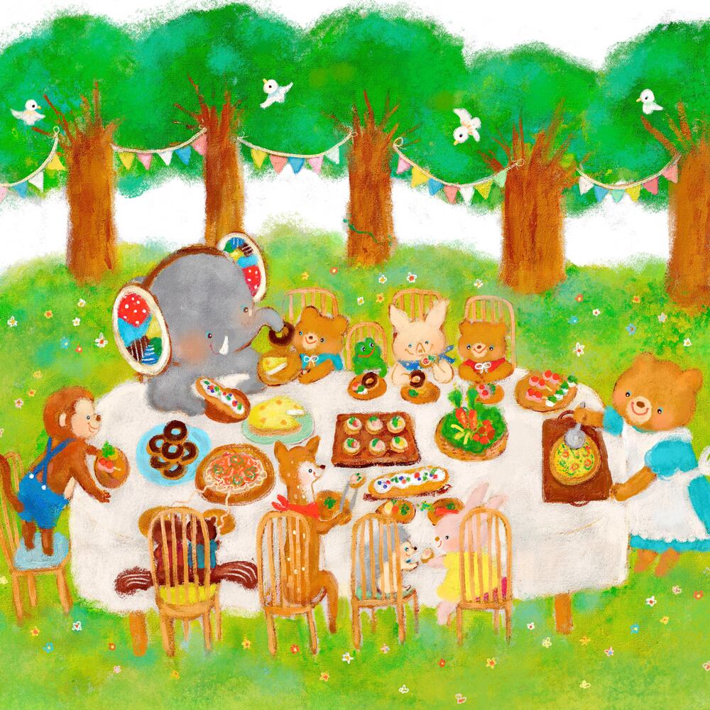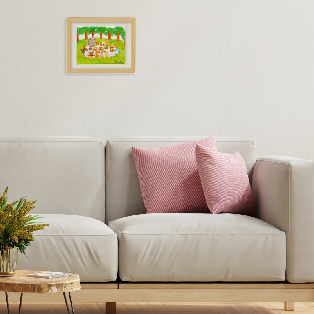 木々が並ぶ明るい森の中で、動物たちがにぎやかにテーブルを囲む様子を描いたインテリアアートです。くまやブタ、ぞうやさるなど、たくさんの仲間たちが集まり、笑顔で食事を楽しむ光景はまるで森のパーティーのよう。カラフルなガーランドが風に揺れ、並べられたおいしそうな料理やお菓子が画面いっぱいに広がっています。見ているだけで心が弾むような幸福感が伝わり、日常にやさしい喜びを添えてくれる作品です。温かみのある色づかいと細やかな描写が魅力のインテリアアートです。
