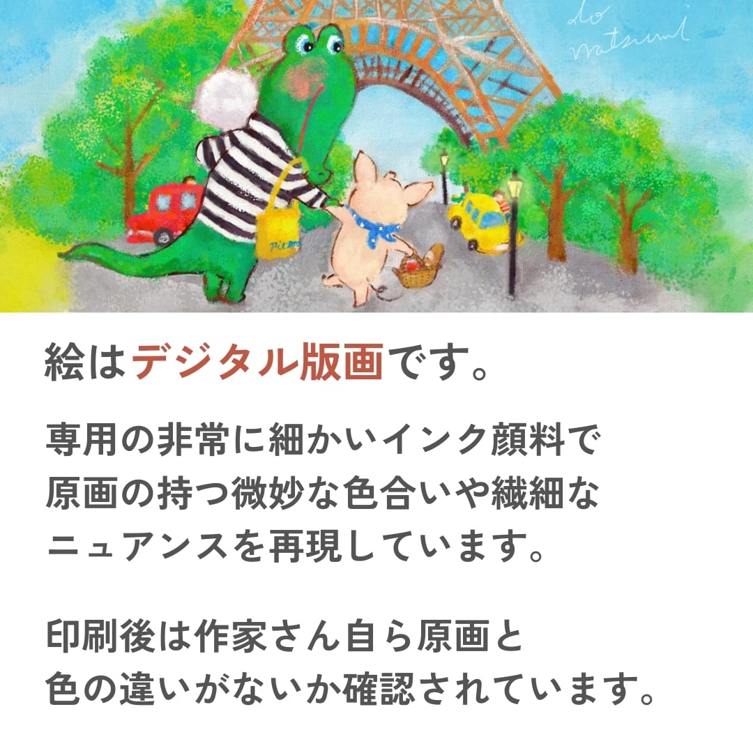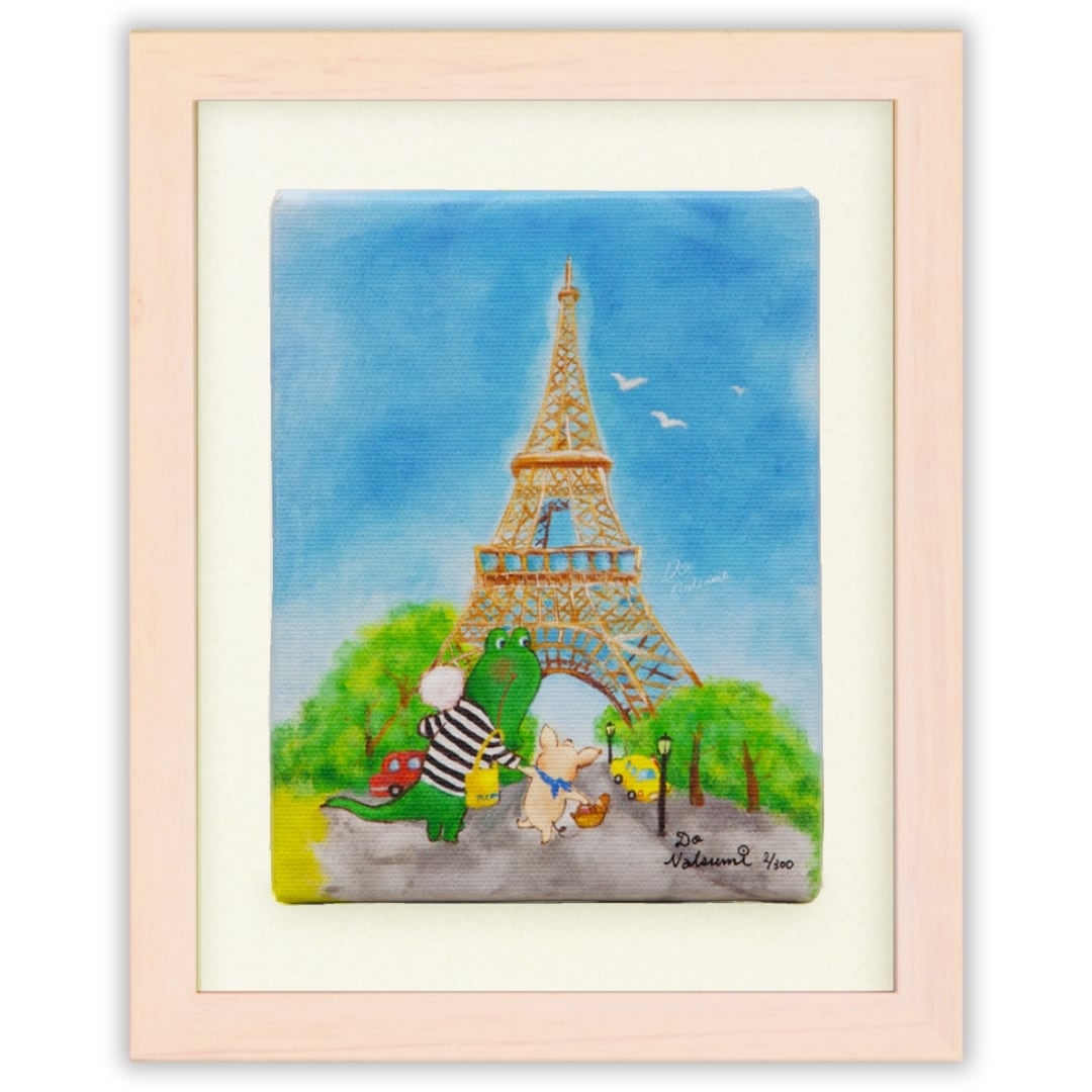 青空の下にそびえるエッフェル塔。その足もとを歩くのは、ストライプの服を着たワニとスカーフを巻いた子ぶた。ふたりの後ろ姿には、旅のわくわく感とやさしい友情がにじんでいます。澄んだ空の青と塔の金色が美しく調和し、軽やかな風まで感じられるような明るい一枚。まるでパリの街角をお散歩しているような、心がふっと軽くなる風景画です。