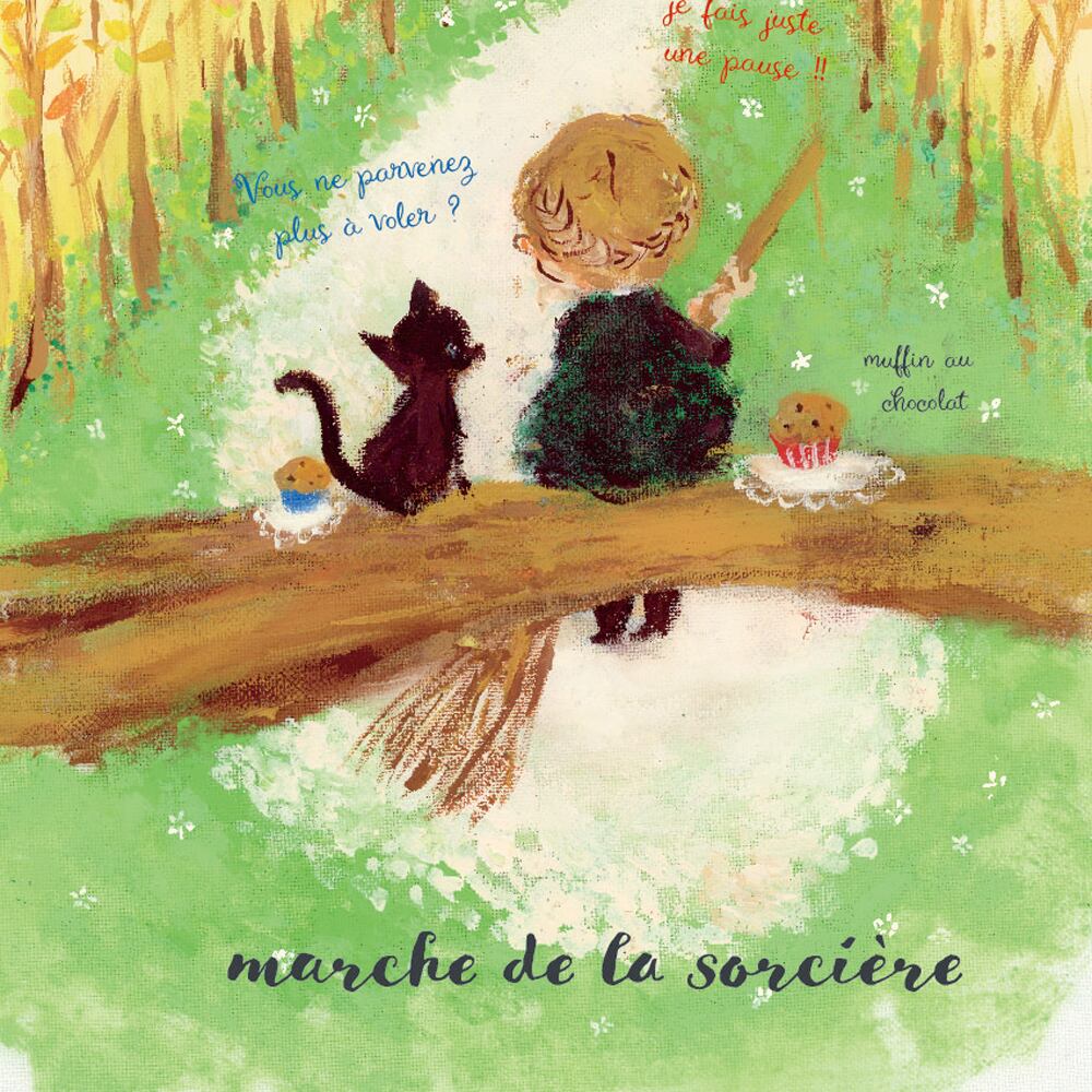 ほうきは少し休憩中。魔女の足元にはチョコマフィンが置かれ、やわらかな風が頬をなでます。