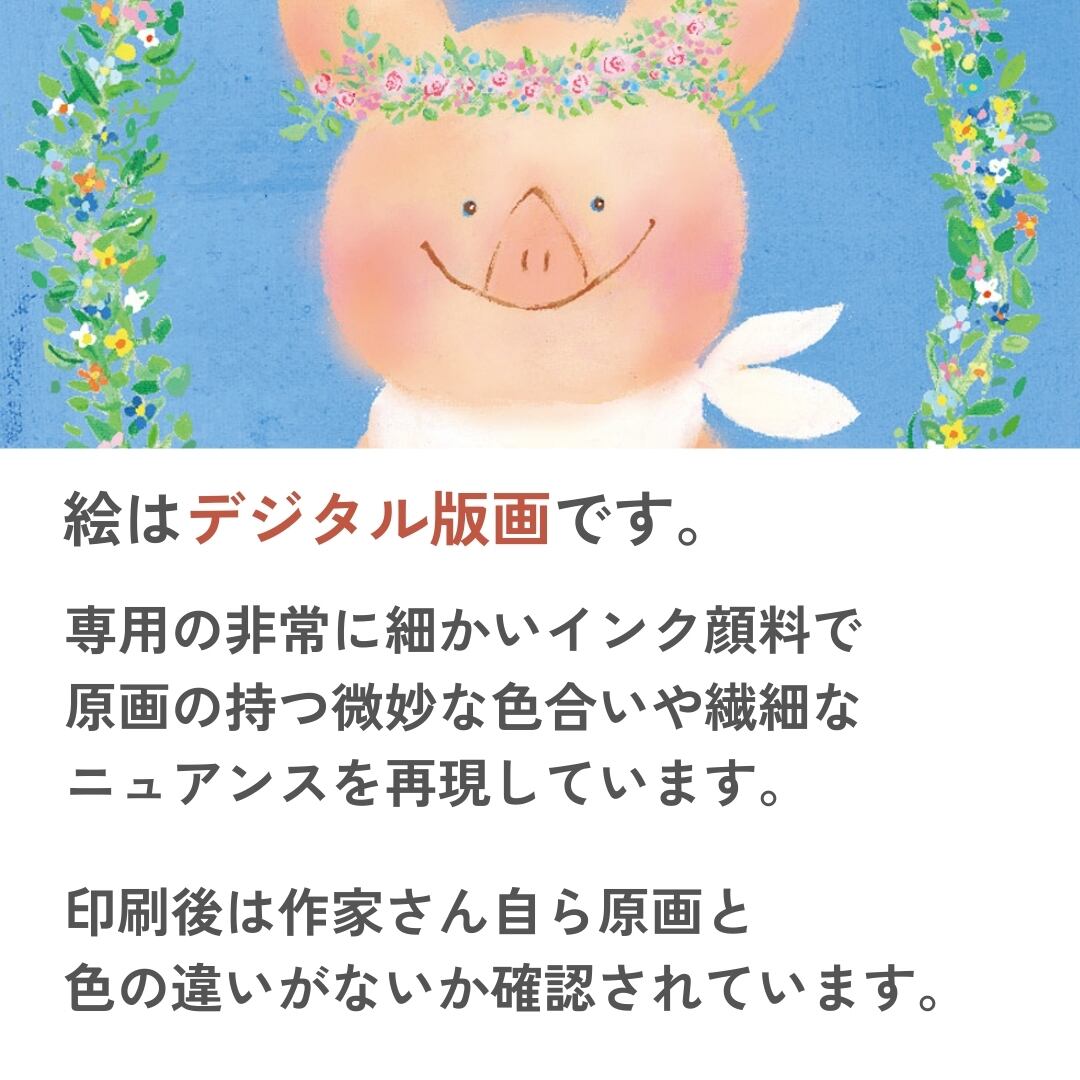 澄んだ青空のような背景に、やさしく微笑む小さなぶたさん。花冠をかぶり、まわりには色とりどりの小さな草花が輪をつくっています。まるで春の風がふわっと吹き抜けた瞬間のような、やわらかな空気が漂う一枚です。ぶたさんの笑顔は、見ている人の心まで明るく照らし、日常の中に小さな幸せを見つけるきっかけをくれます。どんな日も、ほっと心を緩めてくれるような、あたたかいまなざしが印象的です。