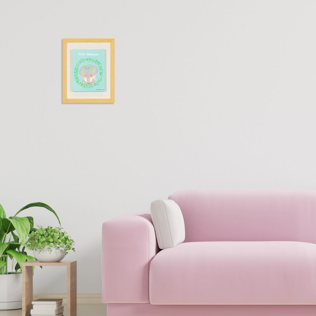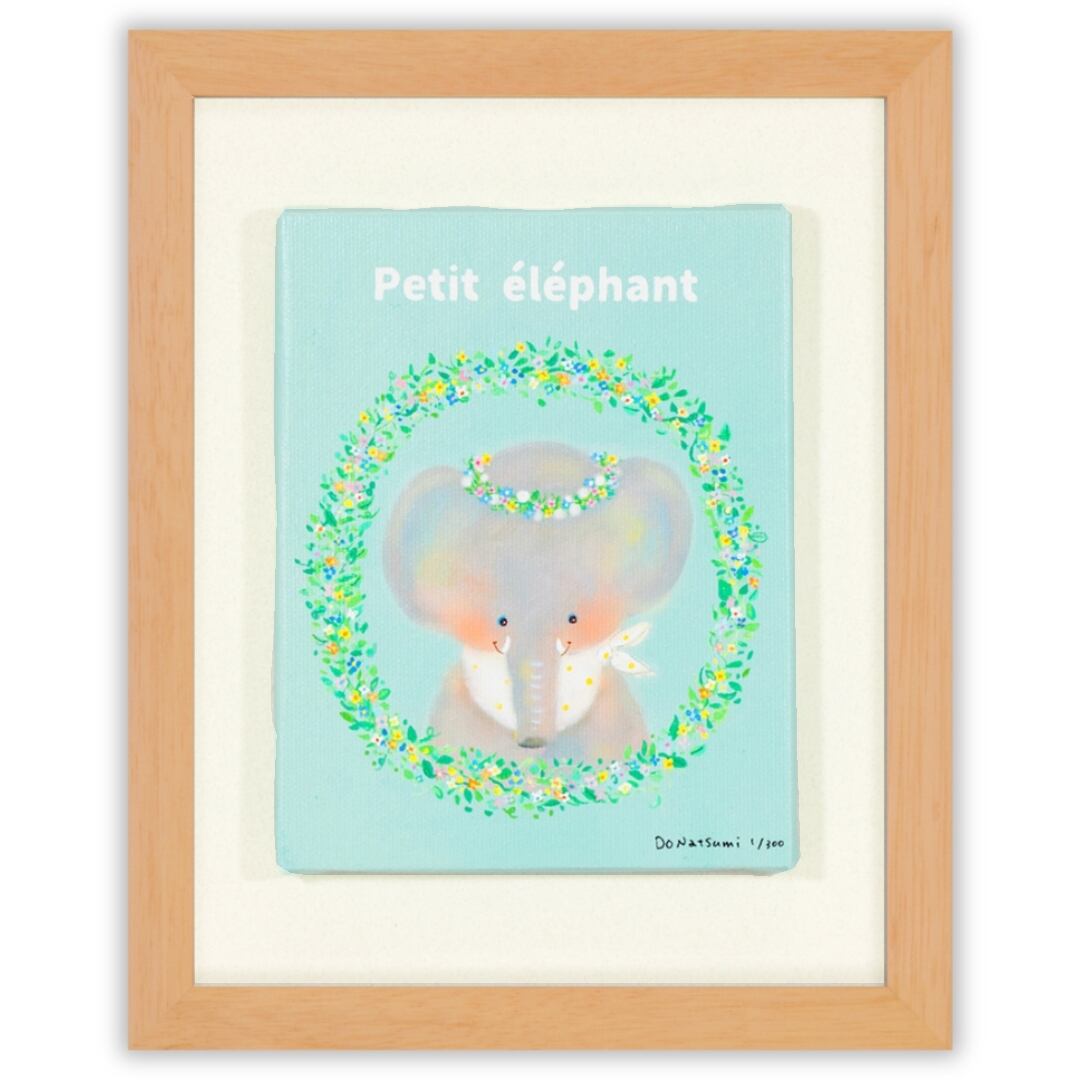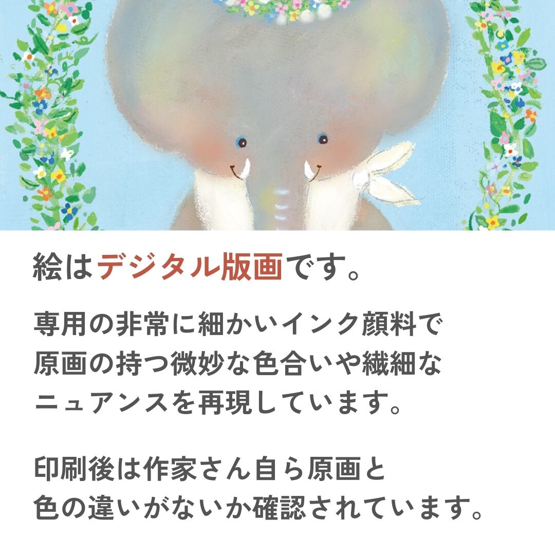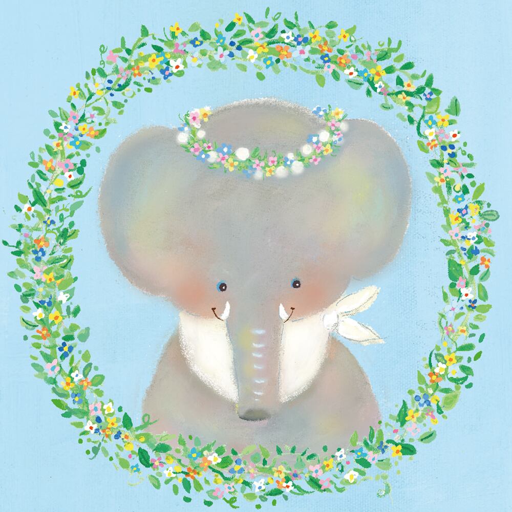 やわらかなパステルブルーの背景に、小さなゾウさんがそっと微笑みます。花々でできたリースがその姿を包み込み、春の光の中で穏やかな時間が流れているようです。やさしい瞳とほんのり色づいた頬が、見る人の心にぬくもりを届けてくれます。まるで静かな朝の光に照らされる小さな森の仲間たちのように、この作品からは癒しとやさしさがあふれています。かわいい動物アートを飾りたい方にぴったりの、心がほっとする一枚です。