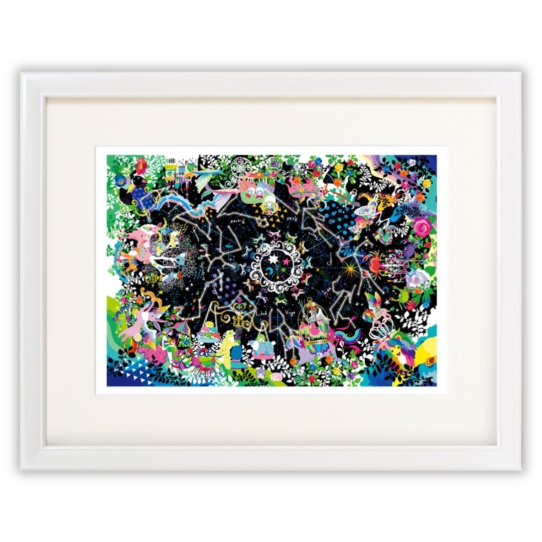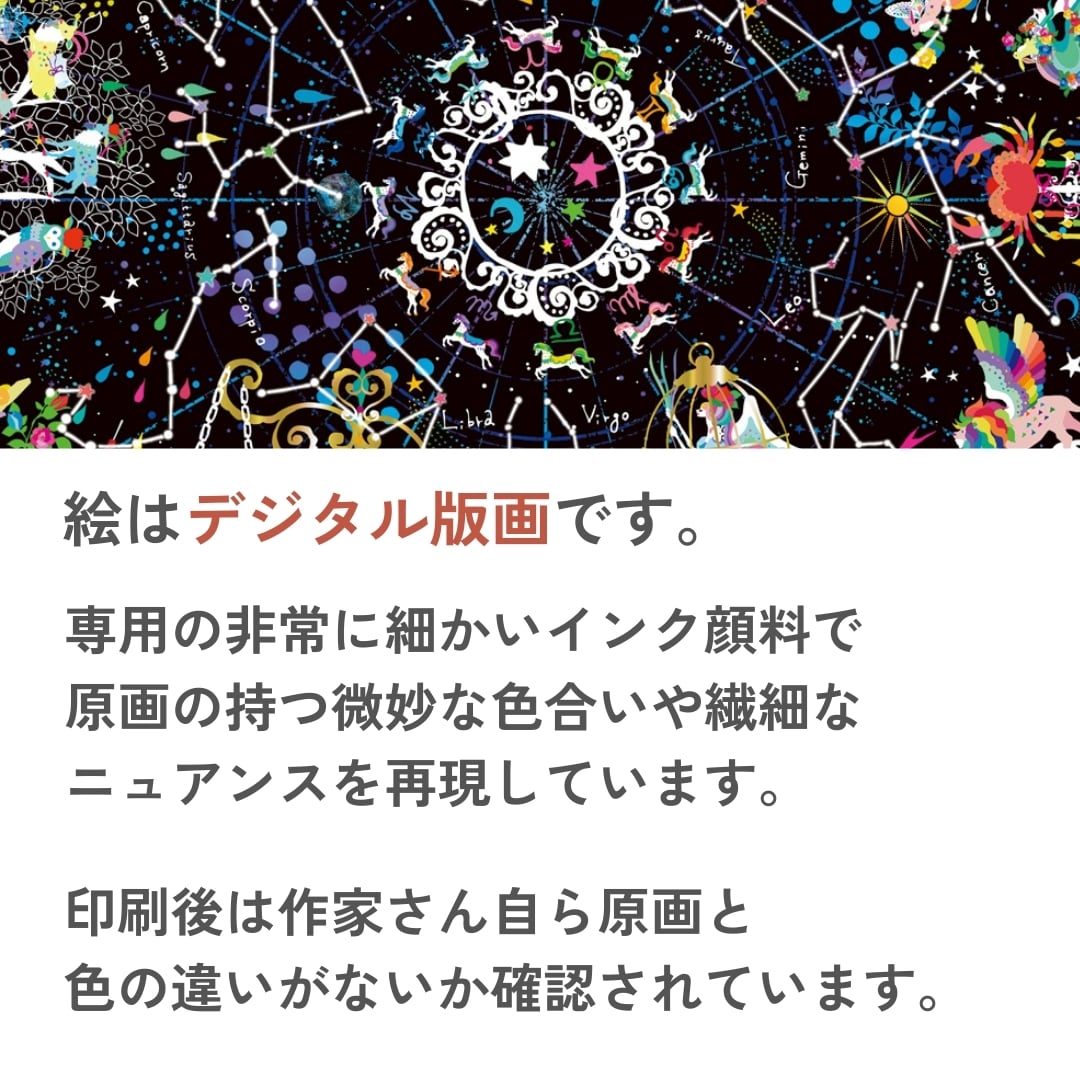 満天の星空を舞台に、木馬たちが優雅に駆け抜けていきます。輝く星座たちは、夜空に描かれた古代の物語のように光を放ち、ひとつひとつが幻想的なリズムを奏でています。蠍座の赤い炎、天秤座の柔らかなバランス、射手座の放つ矢のような光——それぞれの星が、命をもったように絵の中で息づいています。中央には宇宙のような光の渦が広がり、見る者をゆっくりと星々の世界へと誘います。深い黒と鮮やかな色彩のコントラストが、夜空の奥行きを際立たせ、神秘とロマンを同時に感じさせる一枚です。見つめるたびに新しい発見があり、まるで夜空を旅しているような感覚を味わえます。