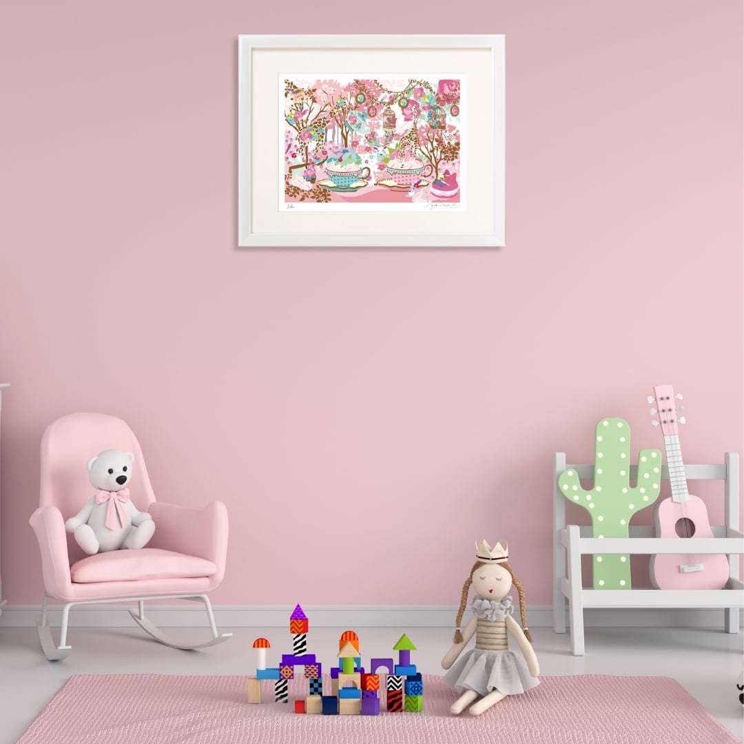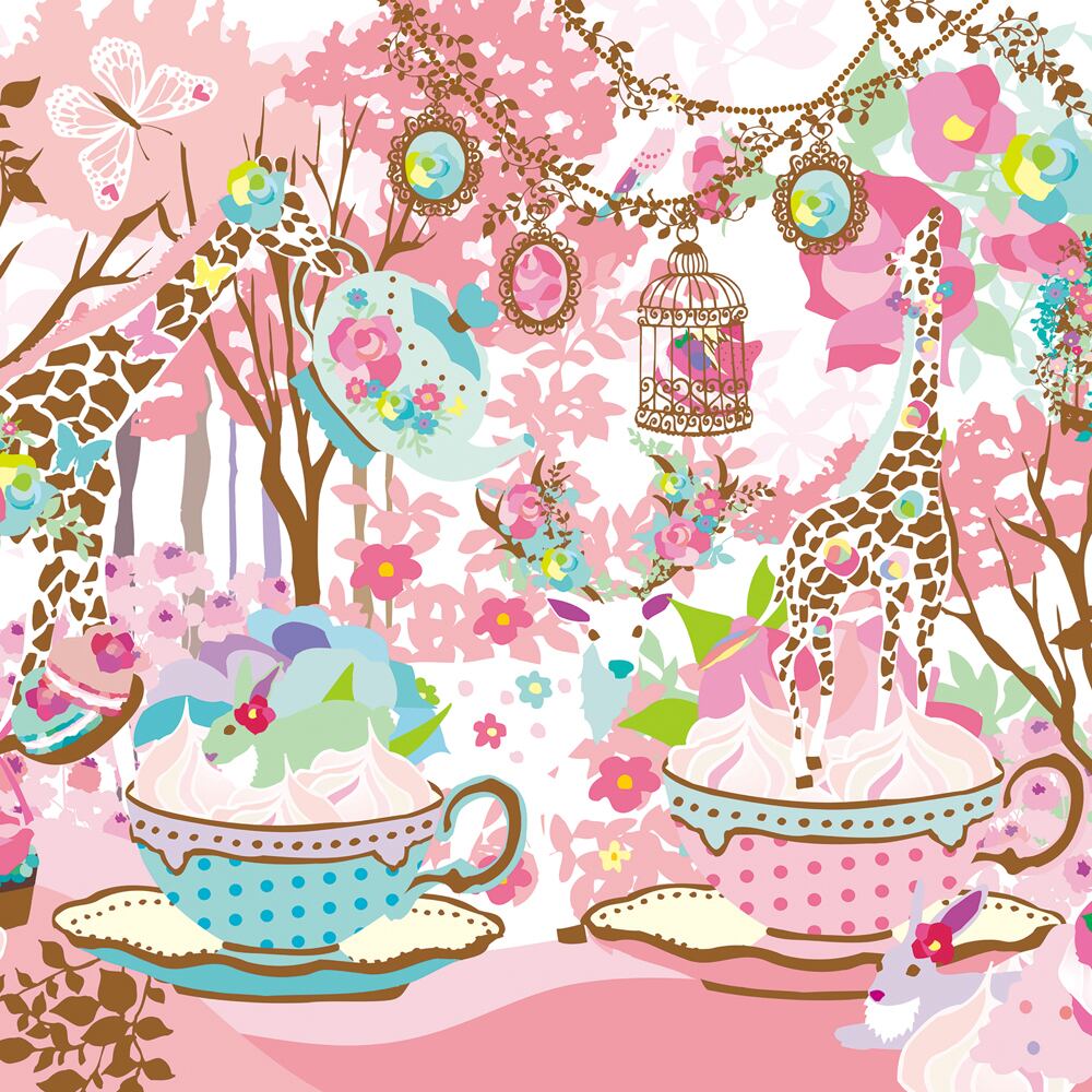 満開のバラの香りが漂うような、甘く優しいピンクの世界。そこではキリンたちがティーカップの中に身を寄せ、花々や小鳥、蝶がふんわりと舞っています。吊るされた鳥かごや小さなフレーム、ティーポットやマカロンのモチーフが、まるでおとぎ話の午後のティータイムを思わせます。柔らかなピンクを基調に、ミントブルーやラベンダーの差し色が上品に重なり、幸福感あふれる色のハーモニーを生み出しています。見ているだけで心がふわりとほどけ、春の日差しに包まれるような温もりを感じる一枚です。繊細な構図とやさしい色彩が、静かな時間に小さな幸せを運んでくれます。