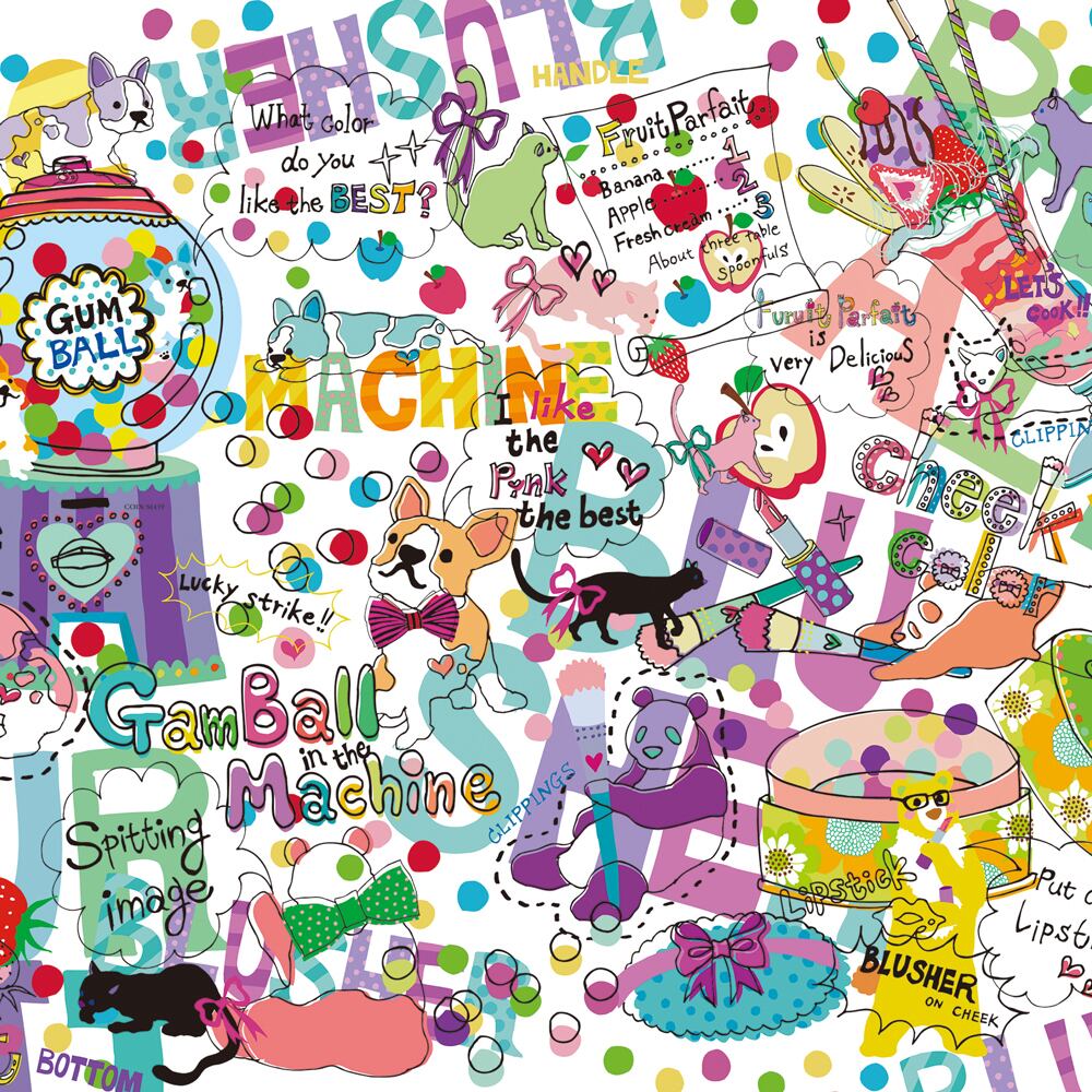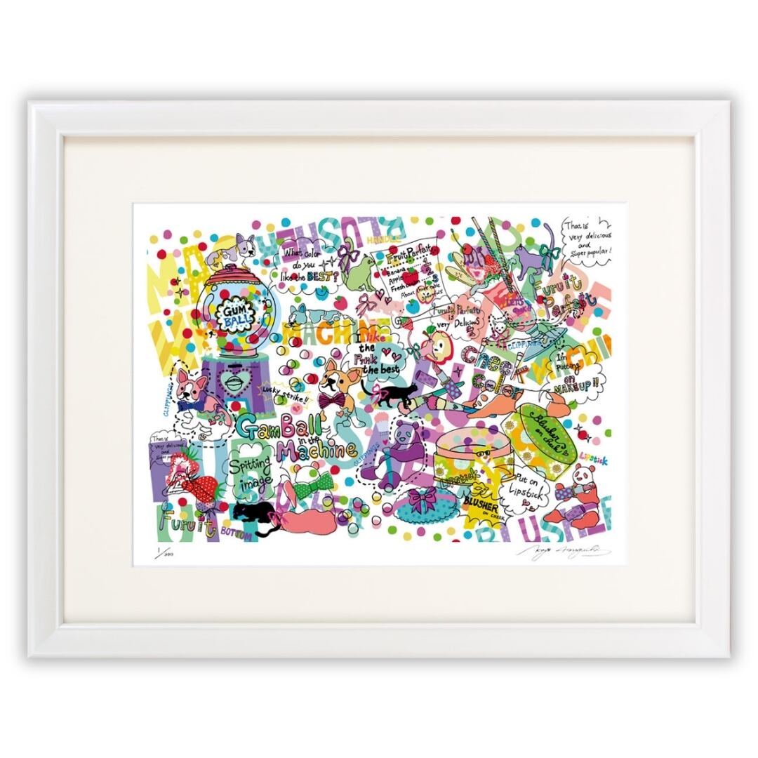 カラフルなガムボールが弾けるように、画面いっぱいに楽しさが広がるポップアート。ガムマシンやコスメ、スイーツ、そして愛らしい犬たちが英語のフレーズとともに踊るように配置され、ひとつひとつのモチーフが自由に会話しているかのようです。ビビッドな色と手描きの文字が重なり合い、リズミカルでキュートなエネルギーを生み出しています。どこを見ても発見があり、見ているだけで笑顔になれるような明るさが魅力。まるで雑誌のコラージュやポップカルチャーのワンシーンを切り取ったような、遊び心あふれる世界です。アーティストの感性が詰まったこの一枚には、日常をカラフルに変える魔法のような力があります。