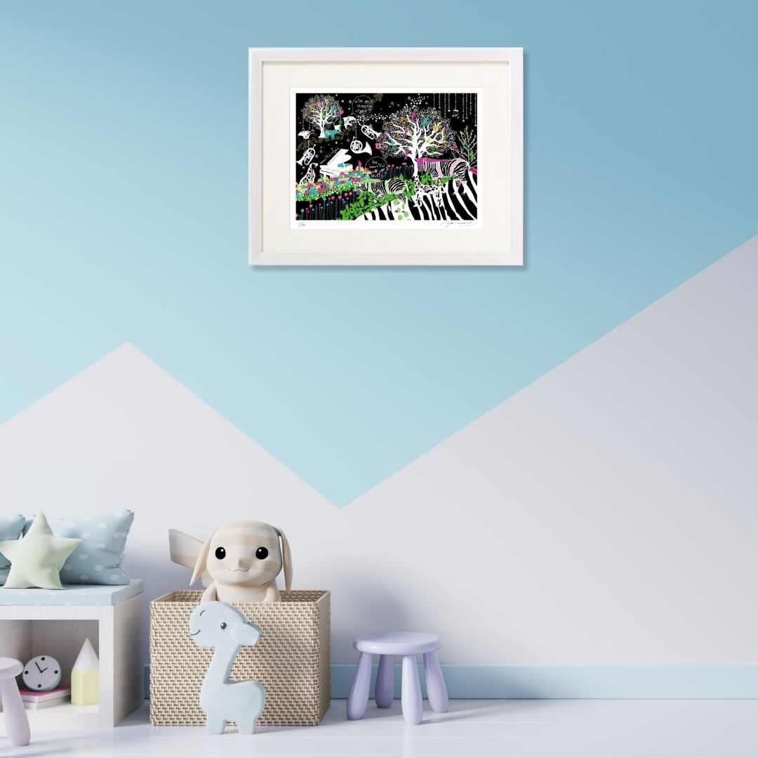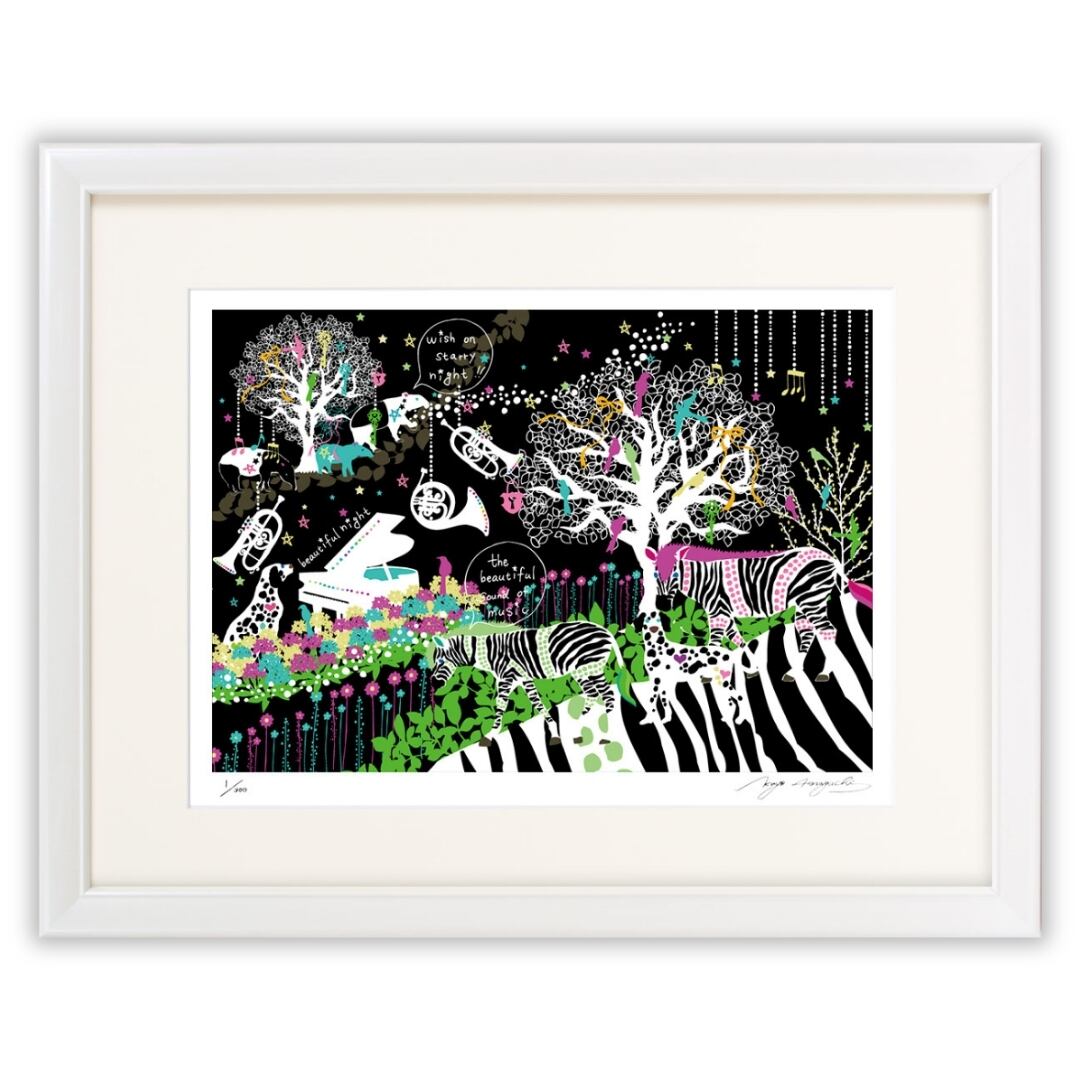 夜空に流れる音楽が、そっと星を揺らしているような静寂と輝きの世界。白いピアノを囲む花々が音符のように並び、シマウマやキリン、ダルメシアンたちが夢の中を歩くように穏やかに佇んでいます。黒を基調にした背景に、パステルカラーの光が点在し、まるで夜空の奥にメロディが漂っているかのよう。木々には小鳥や楽器が吊り下げられ、星々と音が溶け合ってひとつのハーモニーを奏でています。全体がまるで幻想的な音楽会のようで、見る人の心をやさしく包み込み、静かな幸福感を与える作品です。