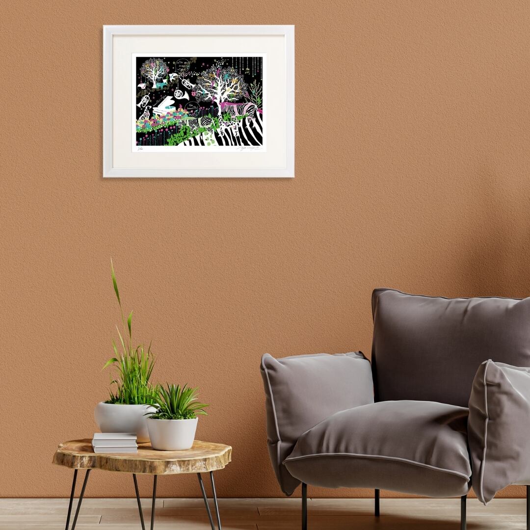 植物、動物などさまざまなモチーフが重なり合う色鮮やかで個性的な作品をインテリアにいかかでしょうか。