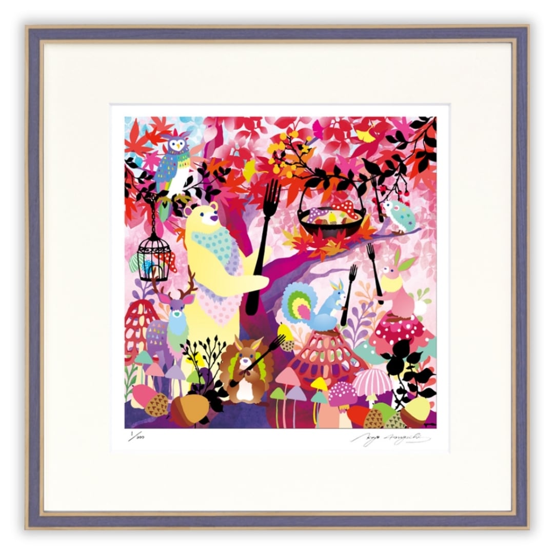 紅葉に包まれた森の中で、動物たちが小さな秋の宴を楽しんでいます。赤やオレンジ、紫、黄金色など、鮮やかに移ろう色彩が重なり合い、まるで季節そのものが歌っているかのよう。クマやリス、ウサギたちがフォークを手に、キノコや木の実を囲んで微笑み合う姿は、秋の豊かさと生命の喜びを象徴しています。背景には森の奥へと続く光が差し込み、幻想的な深みを添えています。動物たちの柔らかな表情や、植物一つひとつの繊細な描き込みが、見ている人の心を静かにほどき、秋の空気を感じさせるようです。あたたかさと美しさが溶け合った、まさに「色づく季節の詩」のような一枚です。