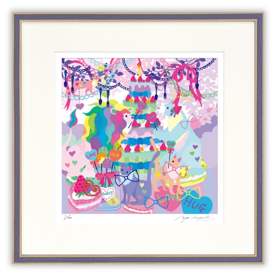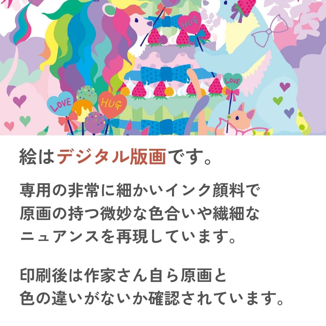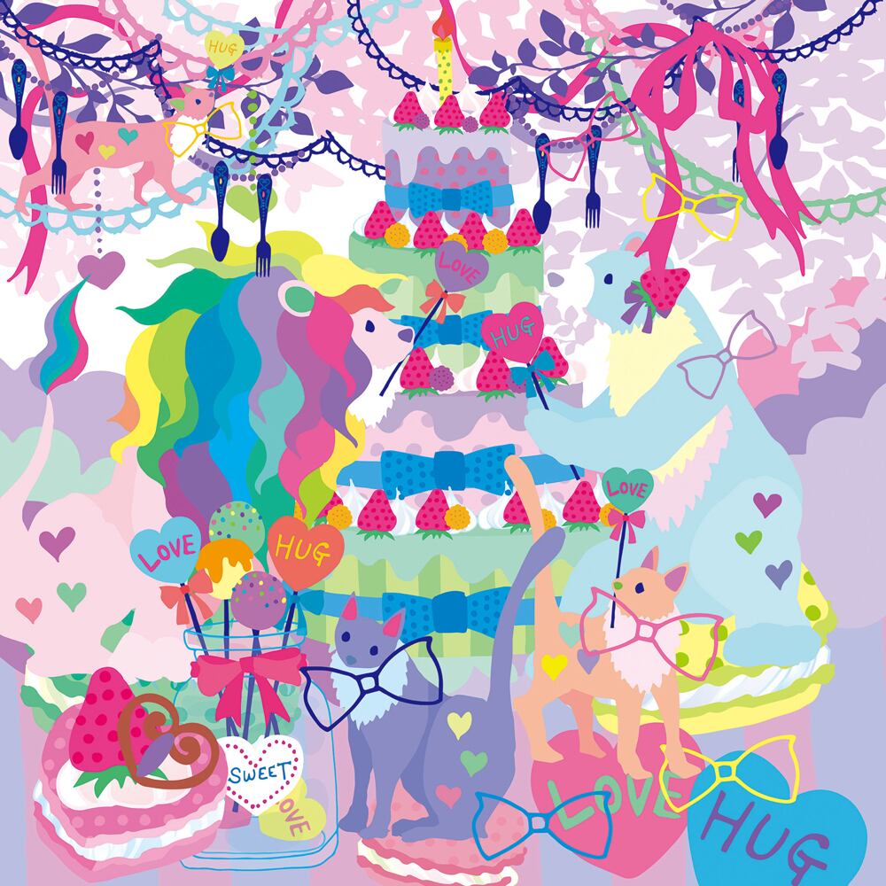 いちごのケーキやリボン、キャンディがあふれる世界で、動物たちが幸せそうに過ごしています。虹色のたてがみをもつライオンを中心に、クマやネコたちが「LOVE」「HUG」の文字が描かれたハートや飴を手に取り、まるで優しさとぬくもりを贈り合っているよう。ピンクやラベンダー、ミントグリーンなど、ふんわりとした色合いが全体を包み込み、見るだけで心がほぐれていきます。リボンやハートのモチーフが作品全体にちりばめられ、まるで夢のようなパーティーの一場面を覗いているかのよう。甘く優しい世界観の中に、「大切な時間を分かち合う喜び」が詰まった作品です。