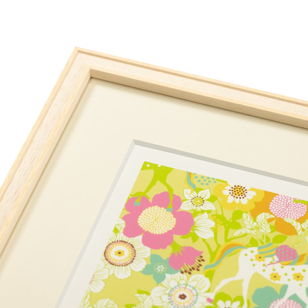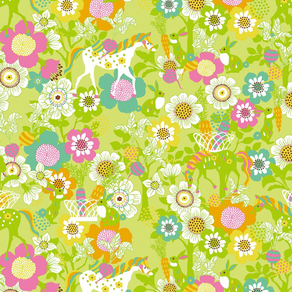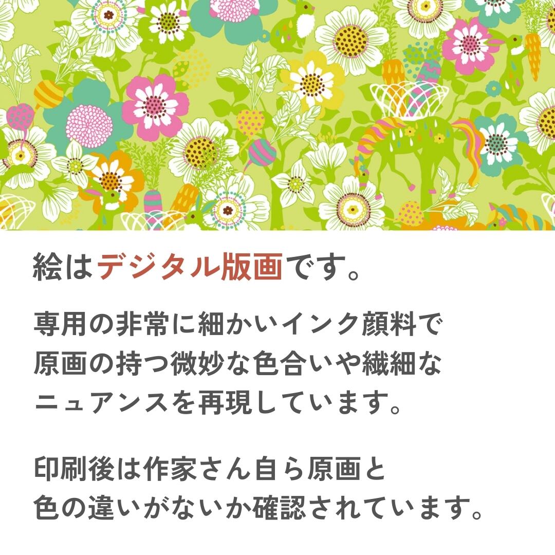 やわらかなグリーンの中に、花々と動物たちがいきいきと描かれた「Vegetable shop – green」。まるで春の光に包まれるような明るさと、野菜や果実の自然な色の調和が心地よい作品です。よく見ると、ユニコーンやキリンたちが花畑の中で静かに過ごしており、まるで森の市場のような賑やかさと穏やかさが共存しています。ピンクやオレンジの差し色が優しくリズムを刻み、どこを切り取っても幸せの香りが漂うよう。眺めているだけで深呼吸したくなるような、爽やかでナチュラルな生命感に満ちた一枚です。
