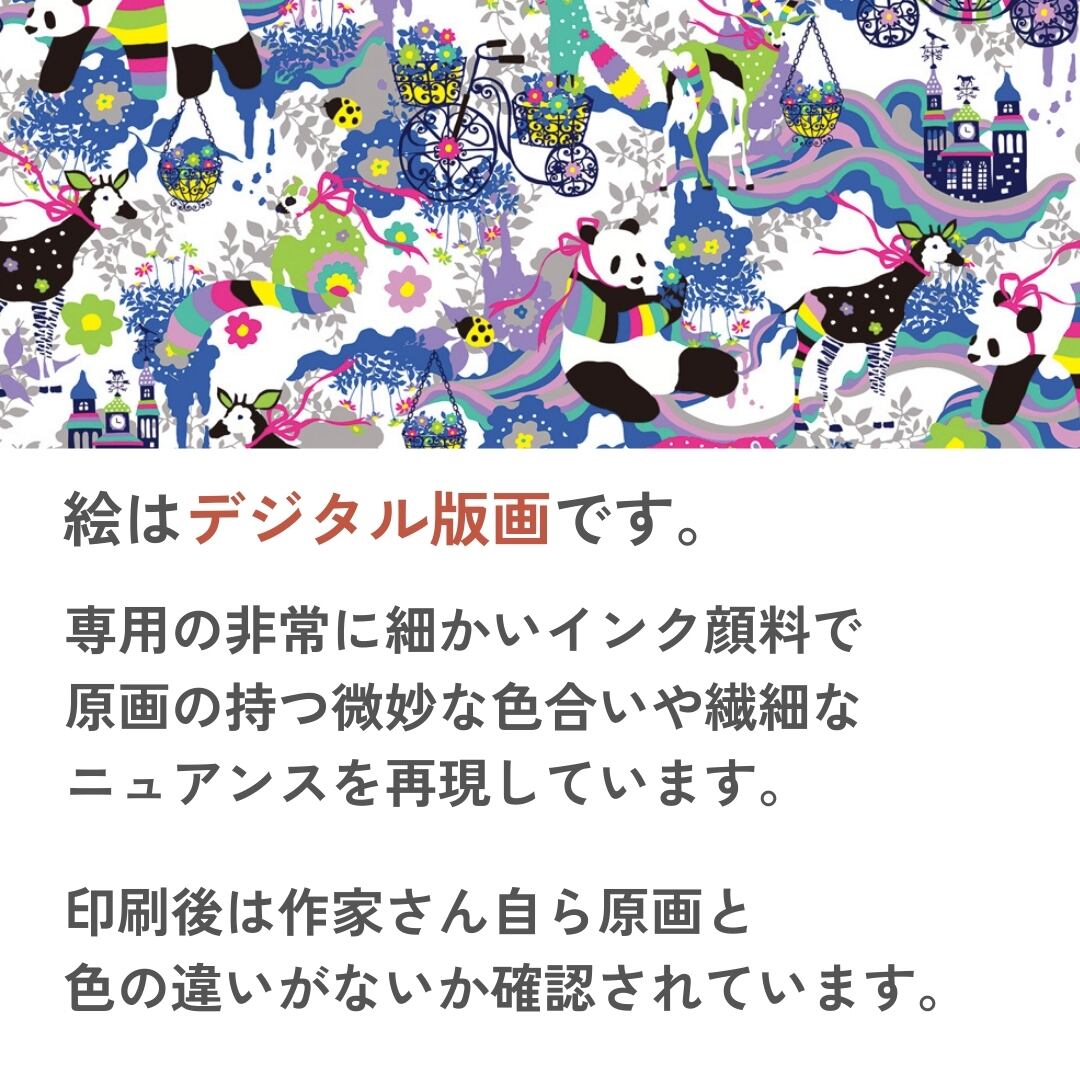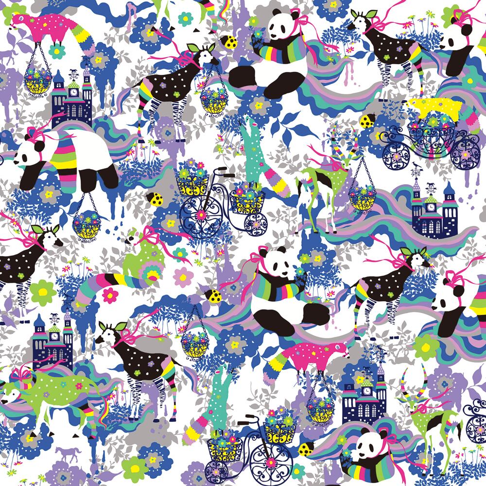 リズムと調和に満ちた世界が広がる「Matching pattern」。カラフルなストライプのマフラーを巻いたパンダたちが、黒いドット模様の鹿や虹色のユニコーンとともに、楽しげに踊るように描かれています。背景には花や建物、自転車、気球のようなモチーフが散りばめられ、全体がひとつのパターンとして絶妙に調和。ポップな色づかいと繊細な線のバランスが見事で、見れば見るほど新しい発見があります。色と形の“おそろい”を探すような楽しさがあり、まるで音楽が流れているかのように軽やかでリズミカルな作品です。