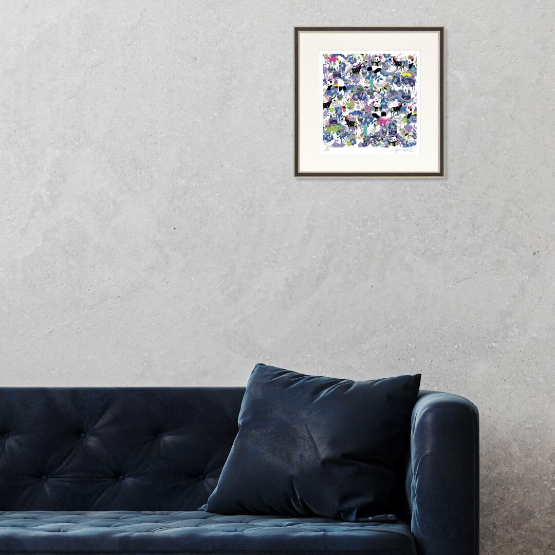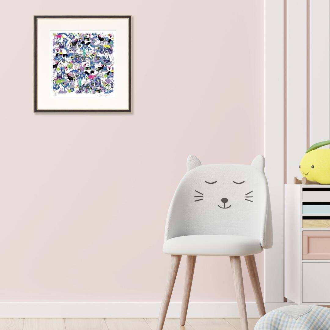 白を基調とした空間に映える鮮やかなカラーリングは、部屋の雰囲気を一瞬で明るくしてくれます。整然としたパターン構成の中に、ユーモラスで柔らかい動物たちの表情が添えられているため、見ている人の心を軽く、穏やかにしてくれるのが特徴。リビングや子ども部屋、ワークスペースなど、どんな場所にも自然に溶け込みながらポジティブなエネルギーを届けます。デザイン性が高く、インテリアのアクセントとしても優秀。忙しい日常の中に“遊び心と癒し”を添えるアートです。