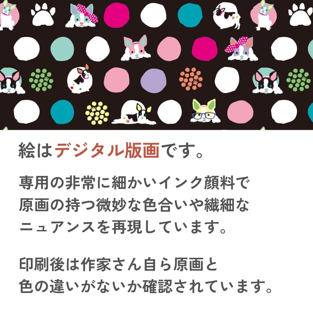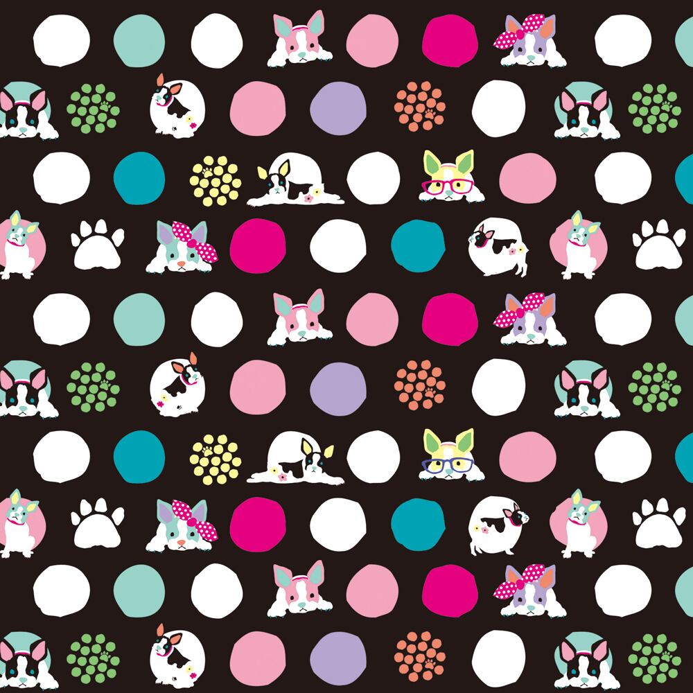 黒をベースにカラフルなドットとかわいらしい犬たちがリズミカルに並ぶ「Footmark dot」。リボンやメガネでおしゃれを楽しむフレンチブルドッグたちが、まるでファッションショーをしているように並びます。背景のブラックがドットの鮮やかさを際立たせ、ピンクやミントグリーン、ラベンダーといった優しい色調が軽やかに踊ります。整然としたパターンの中にも、犬たちの仕草や表情が一つひとつ違い、見るたびに微笑んでしまうようなユーモアと温もりを感じさせる作品です。まるで「今日はどんな気分?」と問いかけてくるような、日常を明るく彩るポップアートです。