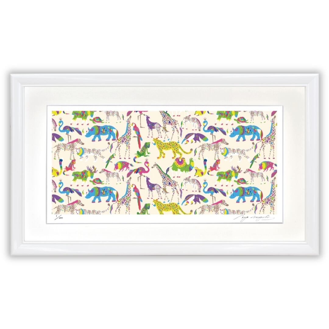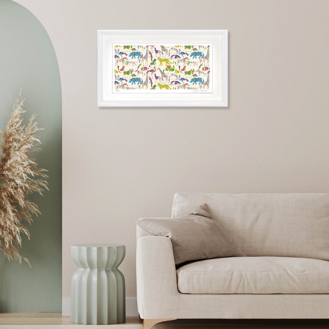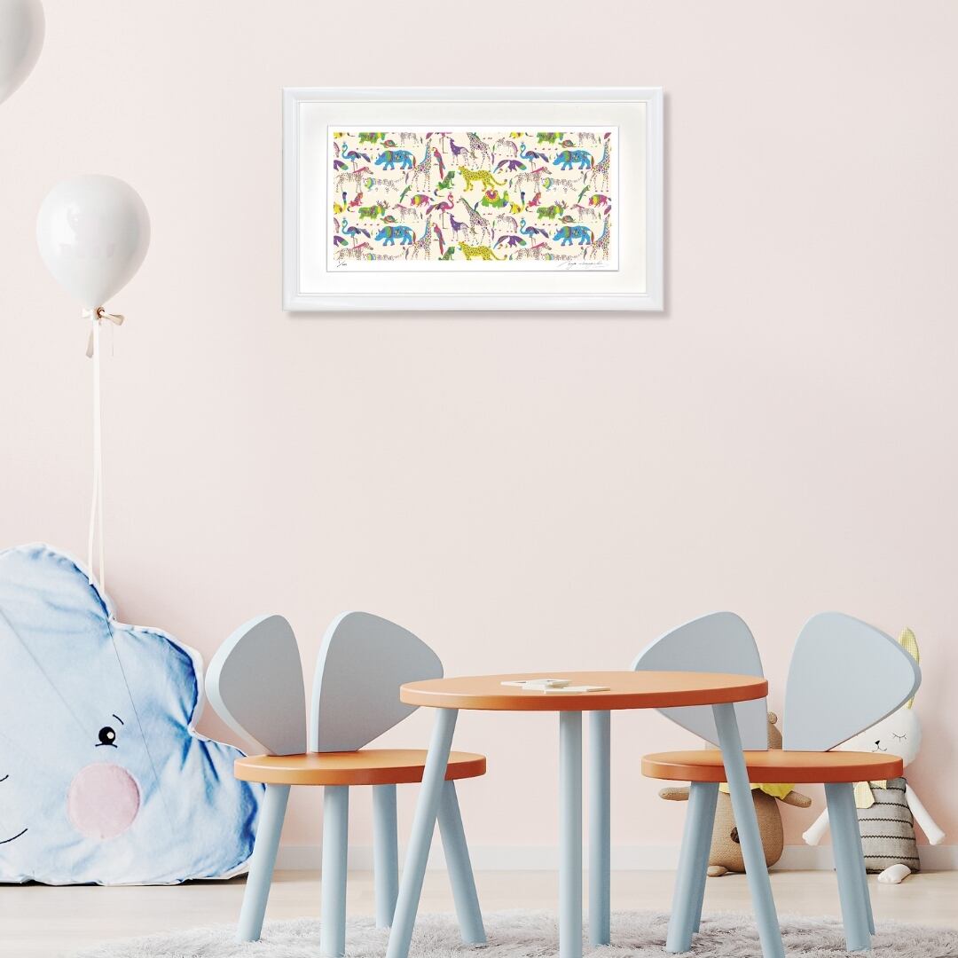 ナチュラルなベージュトーンを背景にしたデザインは、どんなインテリアにも調和しやすく、リビングやダイニング、子ども部屋にもぴったり。見るたびに穏やかな気持ちをもたらし、空間に優しいリズムを生み出します。ホワイトフレームが作品の明るさを引き立て、洗練された印象をプラス。動物たちの軽やかな色づかいが、自然と会話を弾ませるような温かさを添えます。アートを通して「日常の中に遊び心を取り入れたい」という方にぴったりの一枚。やさしさと元気を同時に感じさせる、見飽きない魅力を放つ作品です。
