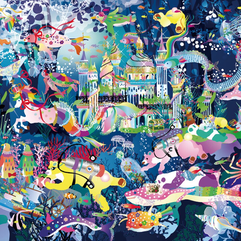深い海の奥へと潜ると、そこには光と音が溶け合う幻想の世界が広がっています。きらめく泡の中を、魚たちや海の生き物、そして陸の仲間たちまでもが自由に泳ぎまわり、どこか楽しげに語り合っているよう。中央には、美しく輝く「海底王国の宝探し」の舞台となる幻想の宮殿がそびえ、青やエメラルド、コーラルピンクなどの色彩が織りなす海の深みを表現しています。細やかなディテールが魅せる動きと光のリズムが見事で、まるで海の中を旅しているような没入感を感じさせます。暗闇の中に漂う光、ゆらめく海藻、泳ぐ生き物たちの優雅な姿——すべてが生命の神秘を物語っています。