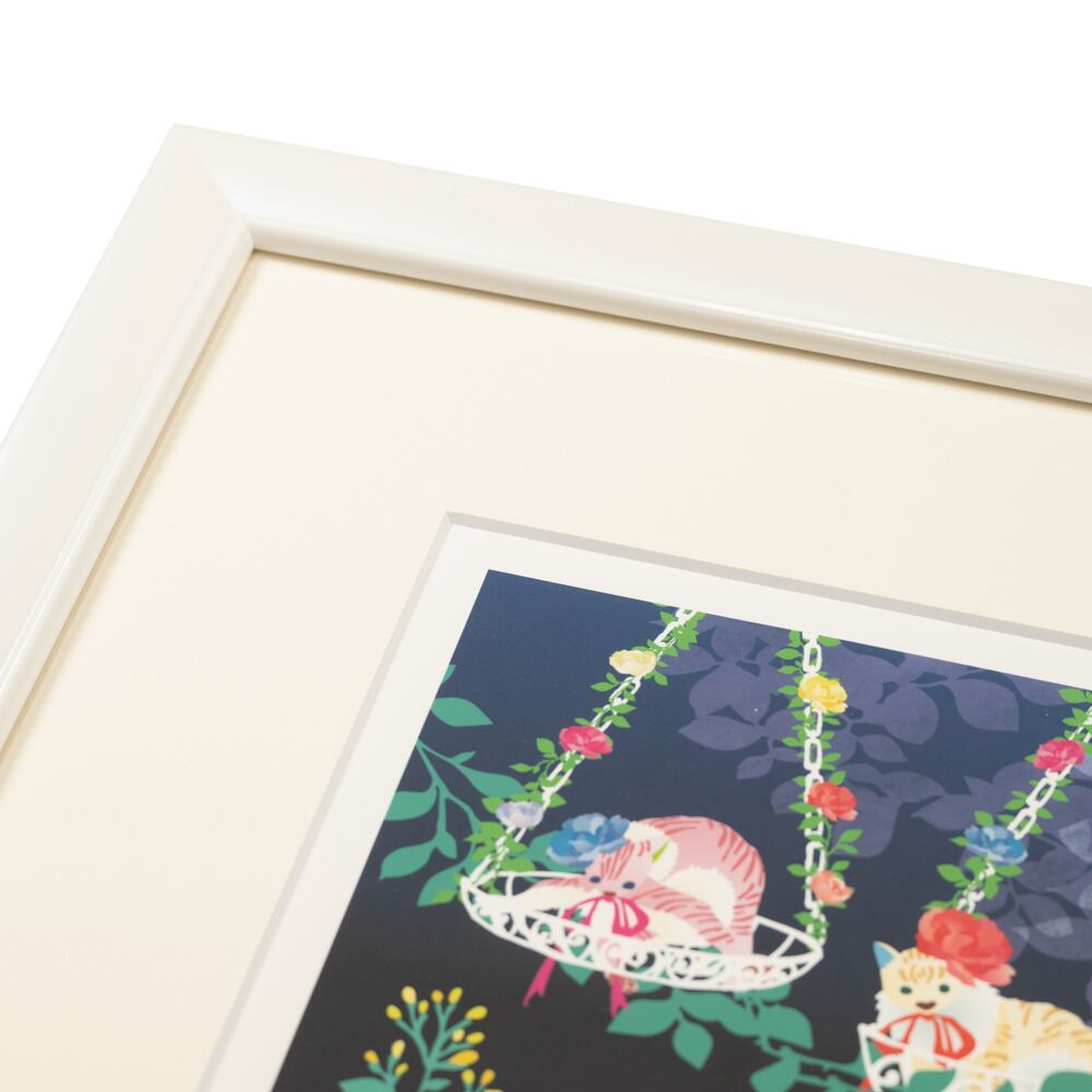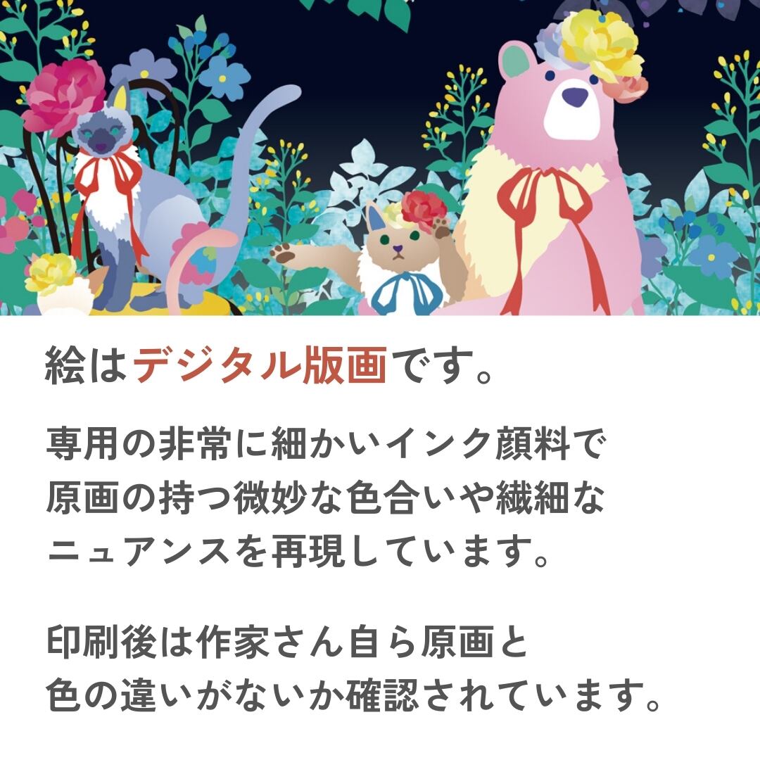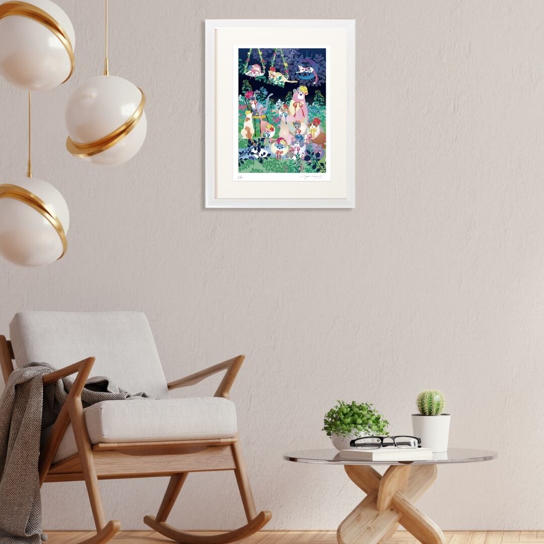 ホワイトフレームの清潔感が、作品の柔らかな色合いと調和し、空間をやさしく包み込みます。リビングや寝室、またはペットを飼っているお部屋にもぴったりで、見るたびに心がなごみ、微笑みがこぼれるような存在になります。夜の穏やかさを描いたこの作品は、忙しい日常の中で“休息の象徴”のように寄り添ってくれるでしょう。かわいいだけでなく、どこか詩的で落ち着いた印象もあり、大人のインテリアにも自然に溶け込みます。見る人に癒しと幸福を届ける、あたたかい空気を運ぶアートです。