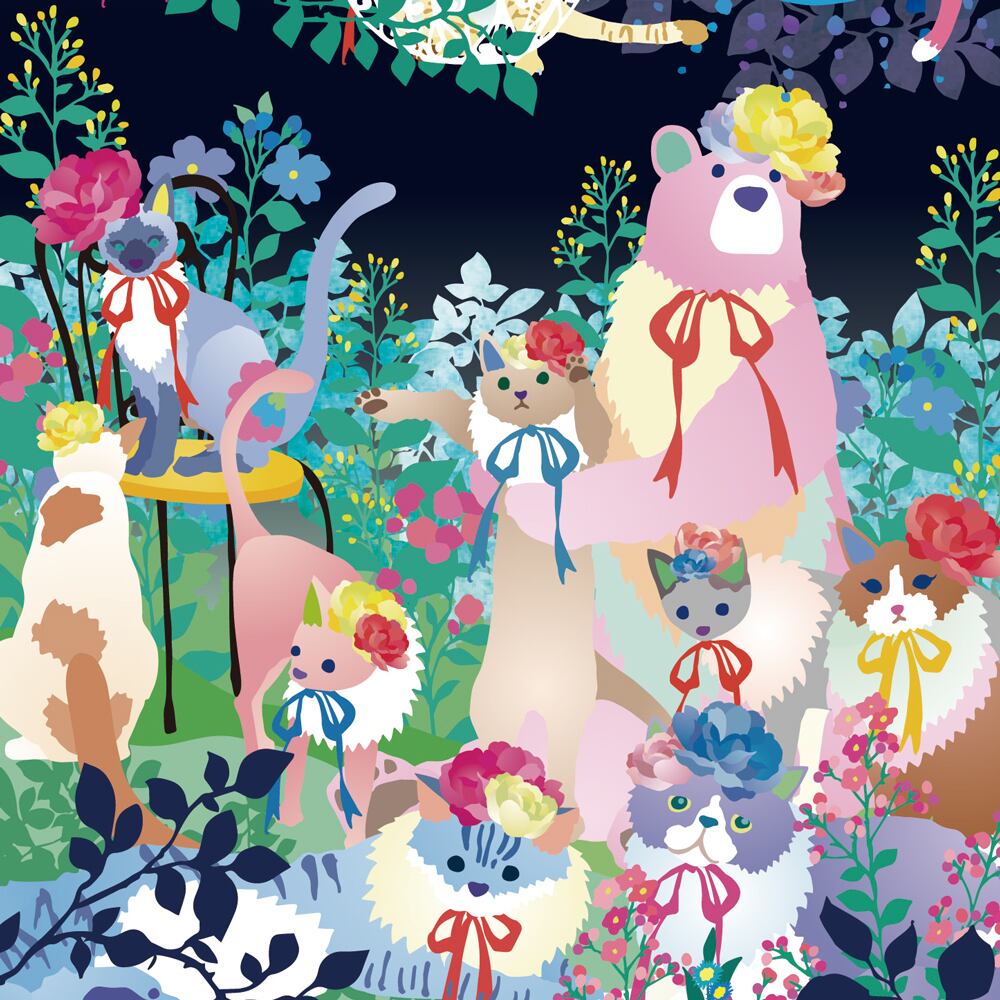 柔らかな夜の森の中、たくさんの猫たちが集まって小さな時間を過ごしています。花の冠やリボンをつけた猫たちは、まるでお祝いの集いに招かれたよう。上の方ではブランコに揺られる猫たちが静かに眠り、下では仲間たちが穏やかに見守っています。緑とネイビーのコントラストが美しく、夜の静けさとやさしい灯りのような温かさが共存する色彩。繊細な花々と毛並みの表現が調和し、見ている人の心をふっとほぐしてくれるようです。可愛らしさの中に、穏やかな時間の流れと深い安らぎが感じられる一枚です。